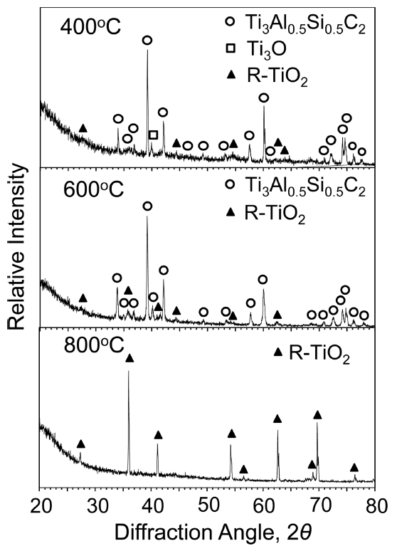 At 400 °C, TiO2 grew slowly, Al2O3 and SiO2 grew much more slowly, and CO2(g) liberated, which could affect the oxidation kinetics and TiO2-transformation in Ti3AlxSi1-xC2. The 600 °C-oxidation revealed strong (rutile-TiO2, α-Ti)-peaks and relatively weak Ti3O peaks (Fig 6), which indicated that the oxide scale was relatively thin, and metastable anatase