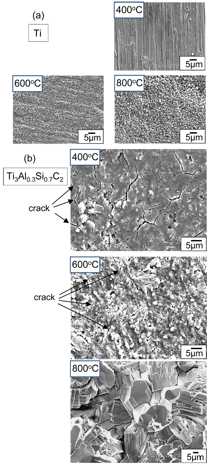 Surfaces of Ti3Al0.3Si0.7C2 after (400-800 °C/3 months)-oxidation were compared with those of Ti, as shown in