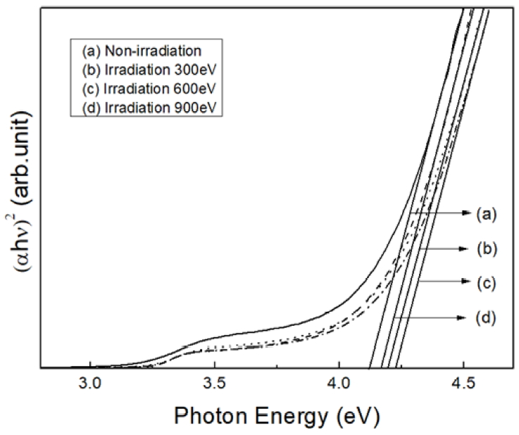 from 7.1 to 8.6 × 1021 cm−3. However, the film that was electron irradiated at 900 eV showed a decreased band
