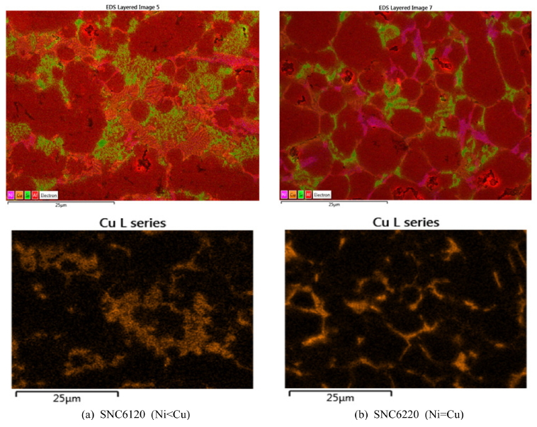 상에 고용이 가능하여 고용강화 효과를 얻을 수 있는 합금원소인 Cu와 α-Al 상에 고용되지 않고 입계에 강화상을 생성하는 합금원소인 Ni을 선정하여