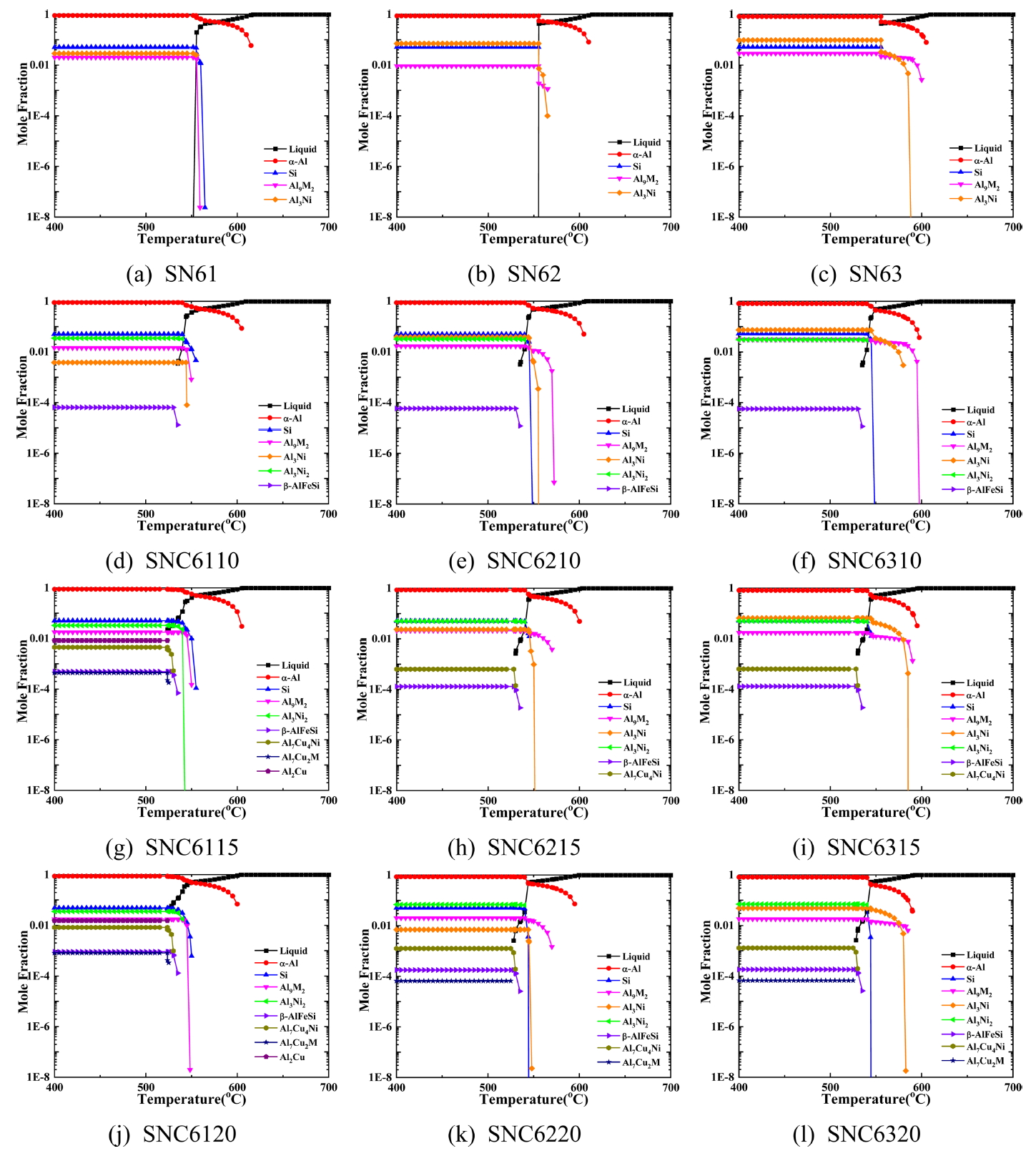 본 연구에서는 열역학 전산모사 프로그램을 이용하여 각 합금에 대한 상 정출거동을 예측하였으며, 상 정출거동 예측 결과를 그림 3에 나타내었다. Al-6.0Si 합금에 Ni을 1.0~3.0 at% 첨가한 SN61 ~ SN63 합금의 상 정출거동(그림 3(a)~(c))을 보면, 초정 α-Al 상 정출 이후 Al9M2 상과 Al3Ni 상이 차례로 정출되며 최종 정출상은 Si였다. Ni 첨가 분율이 증가함에 따라 Al3Ni 상의 분율이 약 1% 부터 3%까지 Ni의 첨가량에 비례하여 증가할 것으로 예상되며 Al9M2상과 Al3Ni 상의 정출 시작 온도는 Ni 첨가분율에 따라 공정온도인 555.49 °C부터 α-Al 상 정출온도인 609 °C까지 증가할 것으로 보인다. Ni은