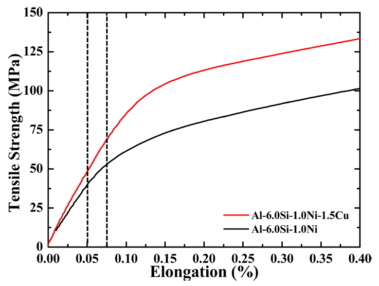 연신율은 감소하는 경향을 보였다. 이는 Ni첨가 시 Al3Ni, Al3Ni2와 같은 고탄성계수 강화상의 생성에 의한 입자강화효과와 α-Al 상에 고용된 Cu에 의해 왜곡된 격자가 전위의 이동에 필요한 전단응력을 증가시키는