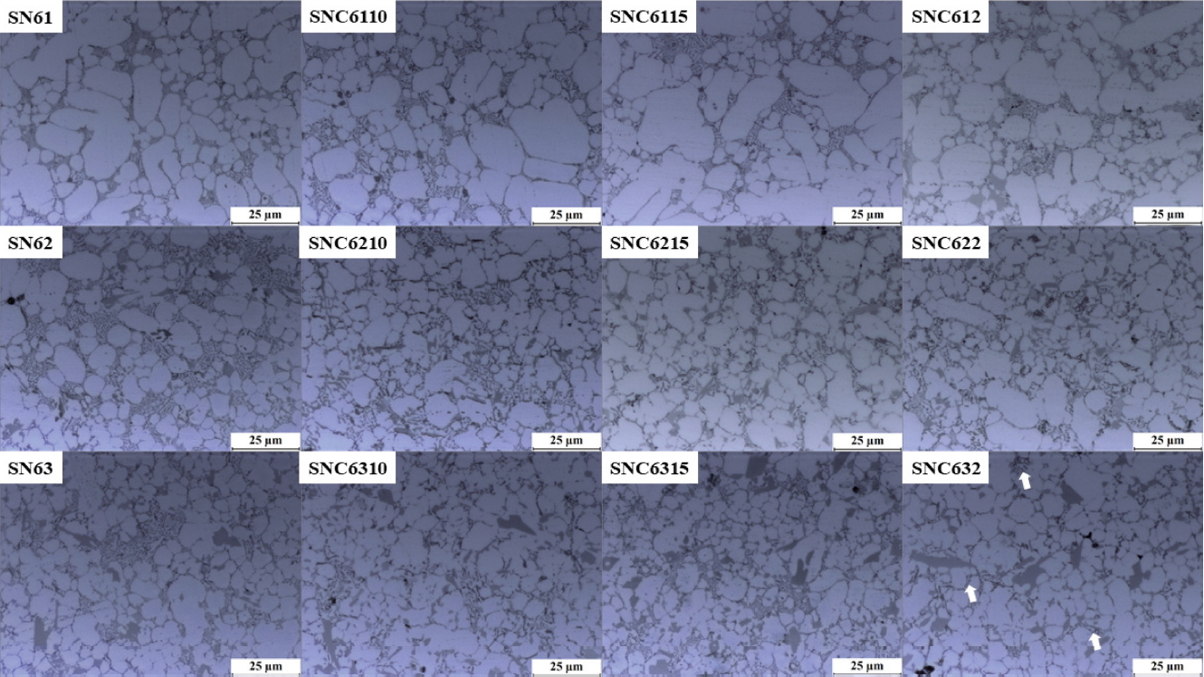 SN61~SNC6320 합금에 대한 미세조직 관찰 결과를 그림 5에 나타내었다. 우선 Ni의 첨가 효과에 대해 살펴보면 Ni 첨가 분율이 증가함에 따라 Al9M2 상과 Al3Ni 상의 분율이 증가하며, Ni을 3.0 at% 첨가한 경우에는 과공정 조성에서 나타나는 Al3Ni 상이 정출되는 것을 확인하였다. SN61 합금에 Cu를 첨가한 경우, 입계에서 Al/Al9M2, Al/Al3Ni2, Al/Al2Cu 공정조직이 혼재하여 발달하였으며 공정조직의 분율이 증가하였다. 그러나 Ni 첨가 분율이 2.0 at% 이상인 SN62와 SN63 합금에서는 Cu