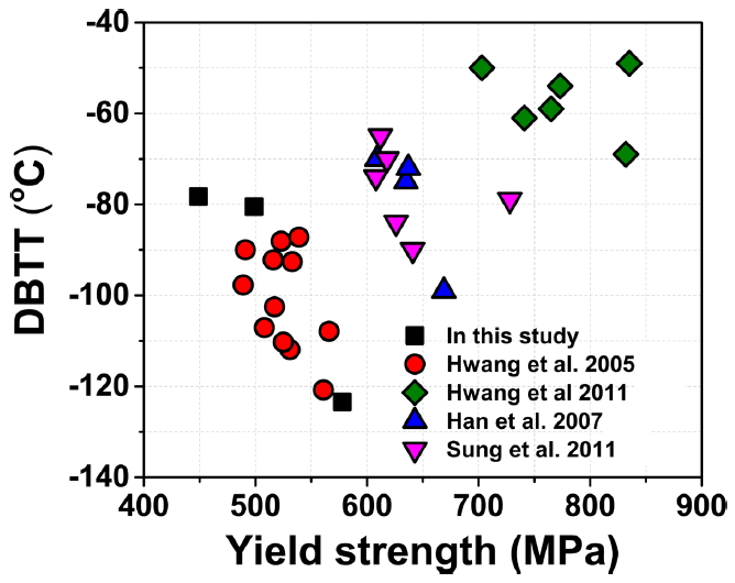 충격 흡수에너지가 필요하다 [16-18]. 여러 온도 구간에서의 충격 흡수에너지와 DBTT는 주로 Charpy 충격 시험을 통해 얻을 수 있으며, 이러한 충격 특성은 화학조성과 미세조직