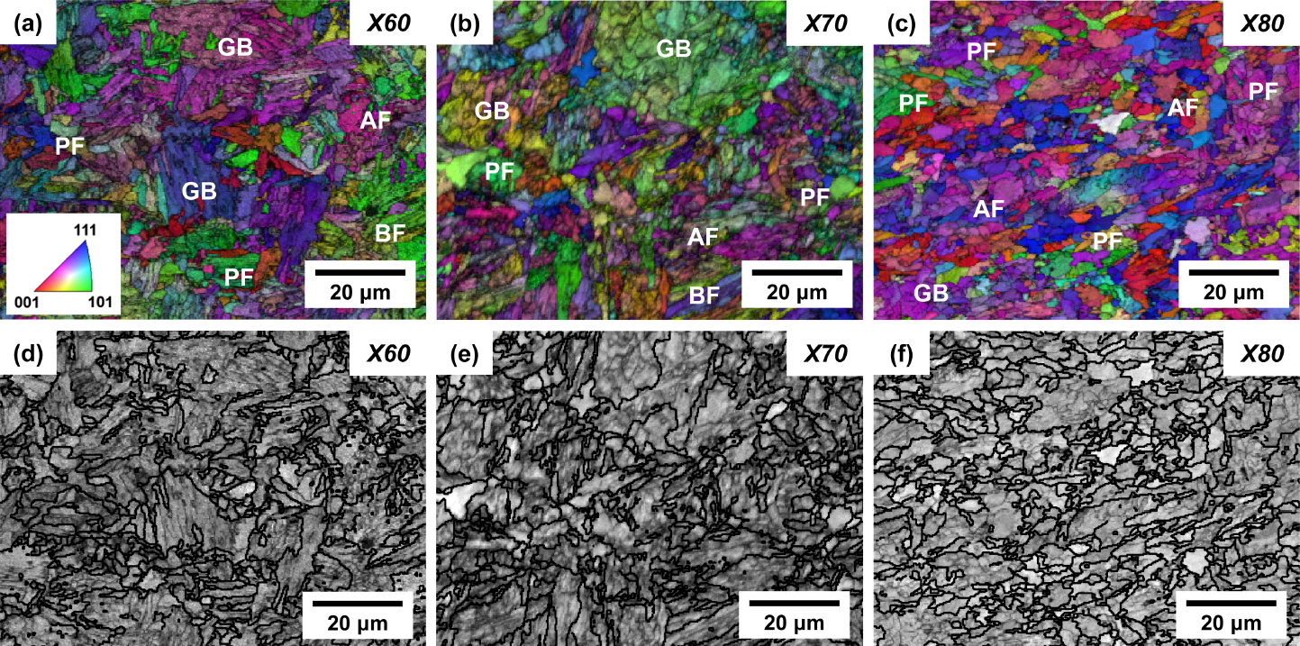 구하였다. EBSD 맵을 통해 계산된 미세조직 분율 측정 결과를 보면(표 2), 모든 강은 50~60%의 높은 AF 분율을 나타내었고, X60 강은 29.2%와 8.8%의 가장 높은 GB와 BF분율을 나타내었다. 반면 X80