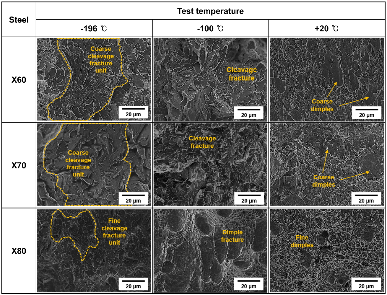 °C에서도 높은 흡수에너지를 가지는 X80 강의 파면은 크고 작은 딤플로 이루어진 연성 파면을 나타내었지만, X60와 X70 강은 모두 DBTT 이하의