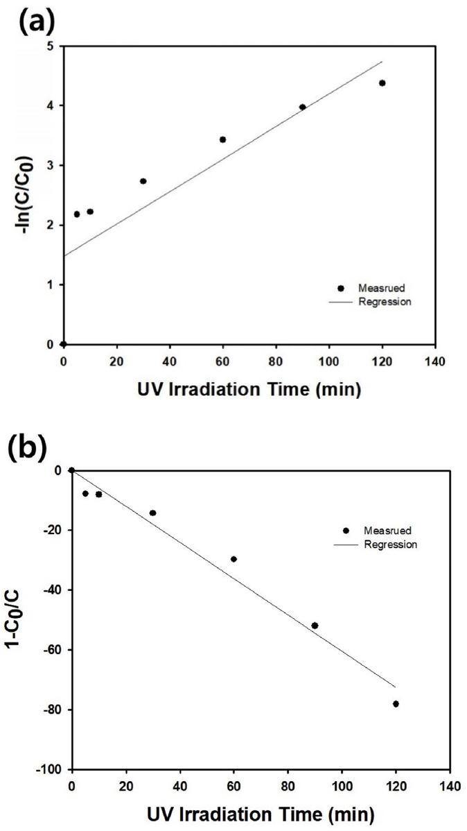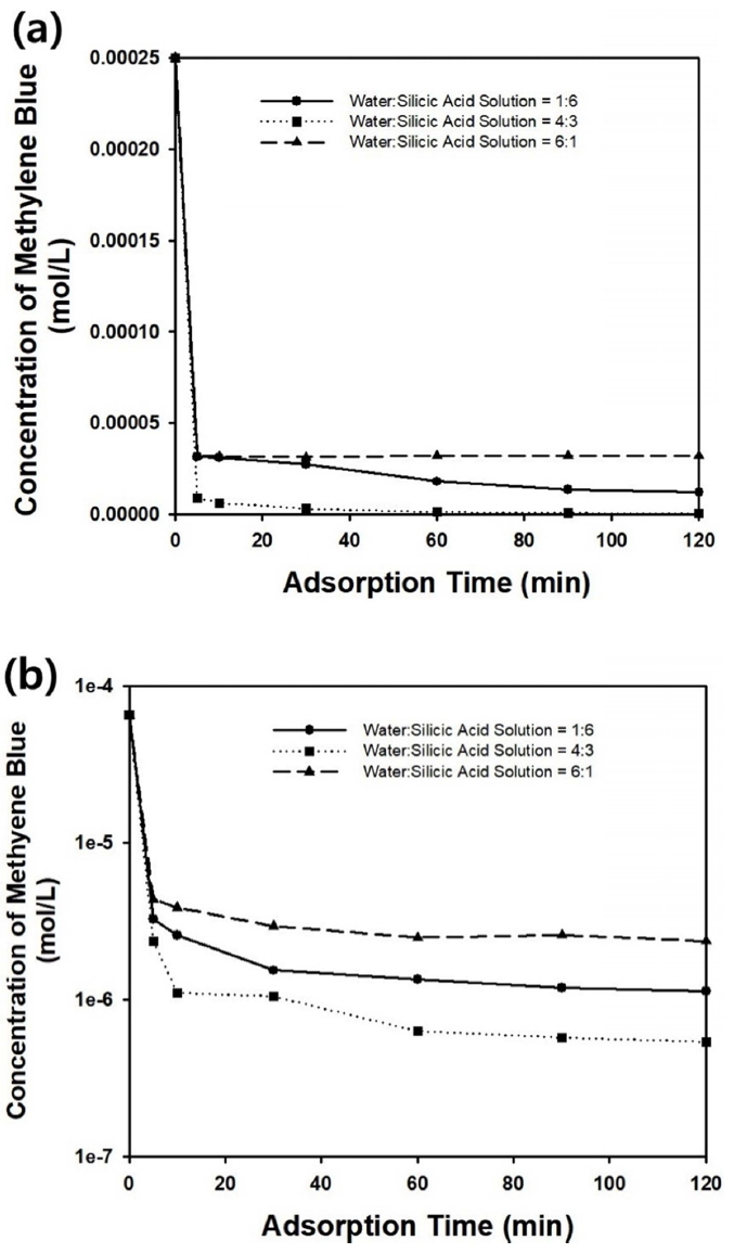 Figure 9(a) shows the change in methylene blue concentration as a function of adsorption time