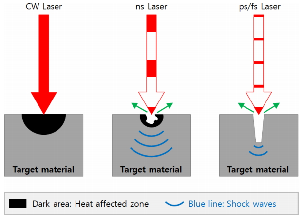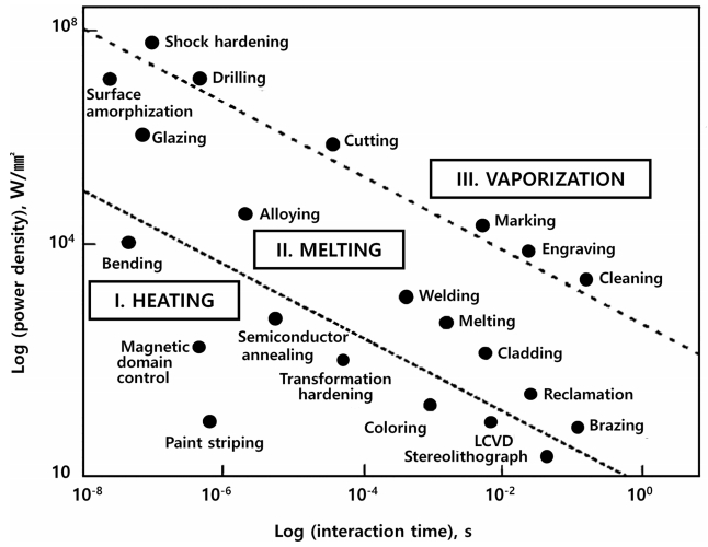 레이저에 의한 기화과정에 대해서는 펄스 레이저 보고서들을 주로 참고하였다. 다음 그림 4에서 연속파 레이저일 경우는 레이저가 소재와 반응하는 시간이 지속시간 (duration time)에 직선적으로 비례하며, 펄스 레이저나 초단파 레이저에서는