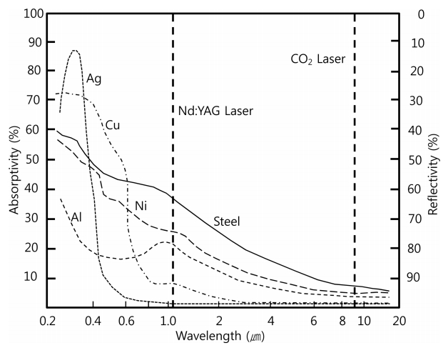 재료 조성, 조사각 및 레이저 파장 등이 관계되는데 그림 2에서 재료와 레이저 파장에 따라 흡수율이 다름을 알 수 있다 [50]. 예를 들어 1미크론 내외 파장의 Nd:YAG 레이저에서 알루미늄합금의 흡수율은 불과 5~15% 이지만, 철강은 40%가 넘는다 [50]. 따라서 알루미늄의 융점은 철강보다 낮음에도 불구하고, 레이저 흡수율이 낮아 용융상태 조절이나 플라즈마 형성을 억제하는 것이 쉽지 않아 자칫 과열로