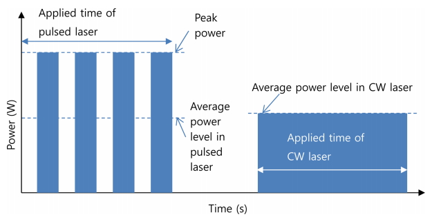 그림 5에서 보듯 펄스 레이저에서는 중간의 휴지시간이 어떻게 되느냐에 따라 총 인가 에너지가 연속파 레이저보다 더 낮을 수도 있고 높을 수도 있다. 출력이