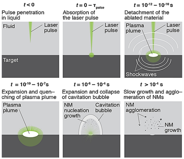 Stauss 등의 연구에 의하면, 레이저 조사 후에 캐비테이션 버블이 가장 크게 팽창한 때에 나노입자 핵이 형성된다. 시간이 지나면서 일부 나노입자들은