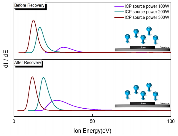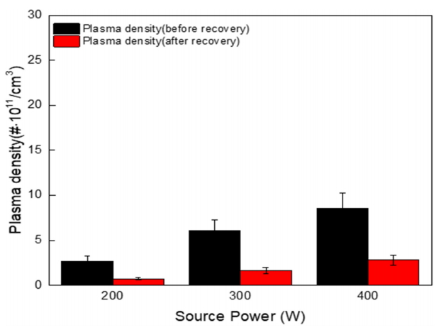 측정된 전자 온도와 플라즈마 밀도는 회수 전후에 거의 동일하다는 것이 확인되었지만 전자온도의 작은 차이로 인해 이온 에너지 분포가 바뀌면 플라즈마