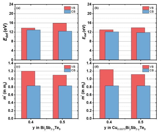 조성비 변화와 Cu 첨가에 따른 전자구조의 변화 원인을 파악하고자 하였다. 그림 4(c), (d)에 CuxBiySb2-yTe3 (x=0, 0.0075, y=0.4, 0.5) 전체 샘플들의 전자상태밀도 유효질량을 나타냈다. VB의 m*를 살펴보면 Cu를 첨가하지 않은 그룹에서 (x, y)= (0, 0.4) 조성(1.20 m0) 대비 (x, y)=(0, 0.5) 조성(1.10 m0)은 더 작은 m*값을 갖고 Cu를 첨가한 그룹(x=0.0075, y=0.4, 0.5)에서는 Cu 첨가 후 두 조성 모두 m*값이 증가하여 각각 (x, y)=(0.0075, 0.4)가 1.24 m0, (x, y)= (0.0075, 0.5)가 1.12 m0로 증가하였다. m*값은 페르미 준위에서 전자상태밀도의 크기와 직접적으로 관련이 있는 물리인자이기 때문에 m*의 변화는 CuxBiySb2-yTe3 의 전자 구조가 Cu의 첨가 및 Bi와 Sb 조성비 변화에 의해 민감하게 변화함을 의미한다. 또한 Sb 비율의 증가와 Cu의 첨가가 CuxBiySb2-yTe3 소재 내에서 전자구조 변화에 있어 유사한 작용을 하는 것으로 보인다.