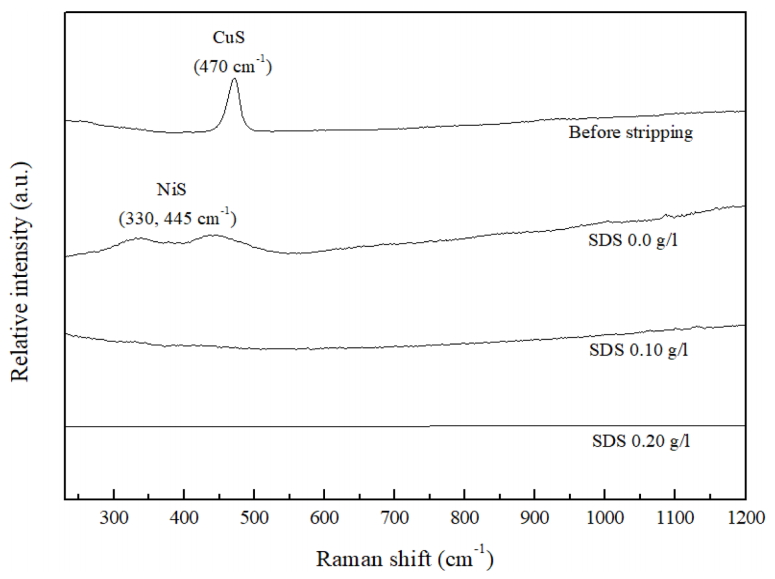 SDS 0.10, 0.20 g/L 첨가된 용액으로 스트리핑된 시편에는 CuS, NiS 모두 나타나지 않았다. 이는 SDS의 참가가 CuS 부동태막