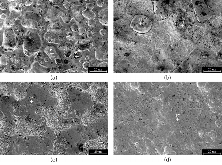 첨가됨에 따라 스트리핑 과정에서 표면 에칭에도 영향을 미쳐 균일한 상을 갖는 미세 구조를 보였다. 이러한 SDS의 첨가에 따른 에칭속도는 그림 3에서 확인한 무게감소율을 통해 확인할 수 있었다. 그림 4 (d)는 SDS 0.2 g/L 첨가한 용액으로 스트리핑한 시편의 SEM 이미지이며, P7로 표시한 바와 같이 평탄부와 에 칭부 구별이 없이 모두 평탄한