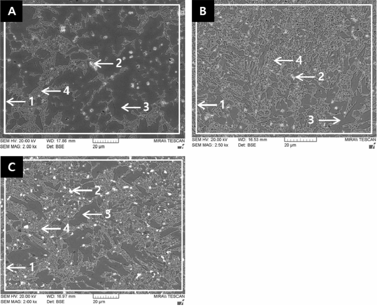 α+δ상으로 구성된 주조조직으로 α상은 수지상(dendrite)형태로 발달했으며 어떠한 열처리 가공도 이루어지지 않은 것으로 보인다. EDS 분석결과를