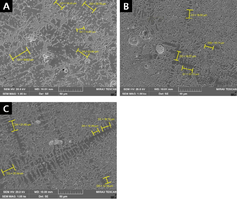 α상인 수지상 조직의 크기는 금속의 냉각속도에 영향을 받기 때문에 수지상 조직의 암 간격 측정을 통해 냉각속도를 추정할 수 있다. 따라서 평균 SDAS(Secondary