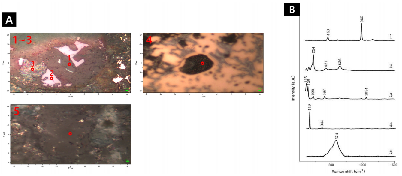 사이에 납산화물, 부식층 사이에는 구리산화물 입자들이 관찰된다 (그림 6). 라만분광분석 결과, 1은 적색 부식생성물로 149, 217, 649 cm-1의 raman shift가 검출되어 Cuprite(Cu2O)로 확인하였다. 2는 연한 녹색 부식생성물로 561 cm-1의 raman shift가 검출되어 Cassiterite(SnO2)로 확인하였다. 3은 회색 부식생성물로 437, 974, 1054 cm-1의 raman shift가 검출되어 Anglesite(PbSO4)로 확인하였다. 4는 회색 부식생성물로 577 cm-1의 raman shift가 검출되어 Cassiterite(SnO2)로 확인하였다. 5는 녹색 부식생성물로 149, 177, 217, 268, 430, 532, 1066, 1097 cm-1의 raman shift가 검출되어 Malachite(Cu2 (CO3)(OH2))로 확인하였다(그림 7). Malachite와 Cuprite의 경우 청동유물에서 가장 흔하게 볼 수 있는 부식생성물로 일반적으로 입자뿐만 아니라 층상으로 성장한 형태를