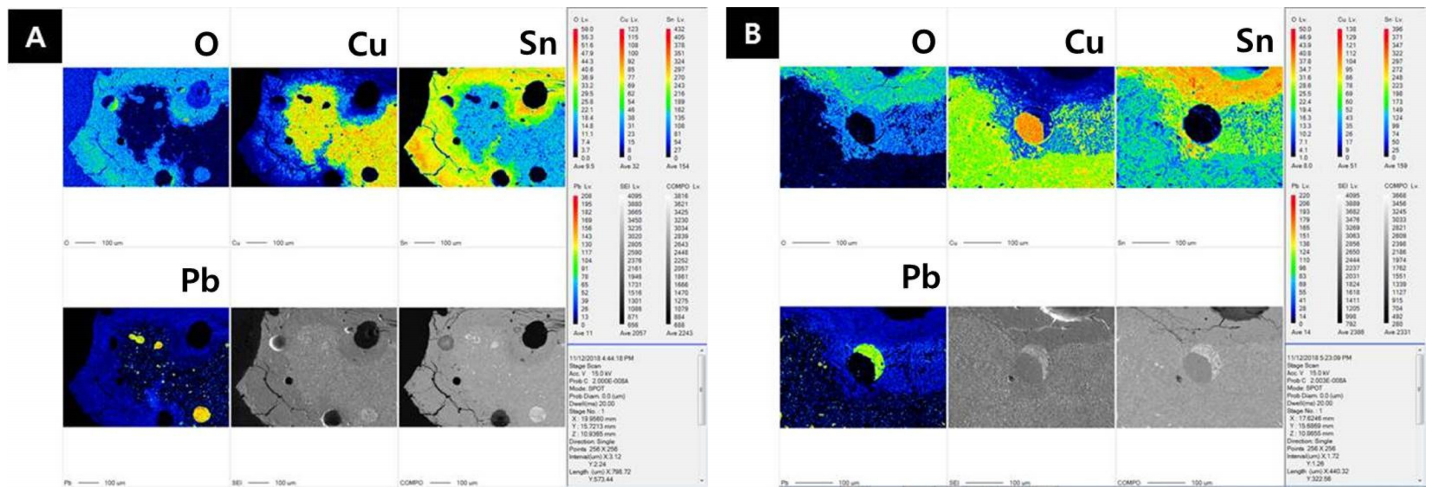 Na-23 Bronze Sword EPMA Mapping Image. (A)Corrosion layer, (B)Secondary copper.