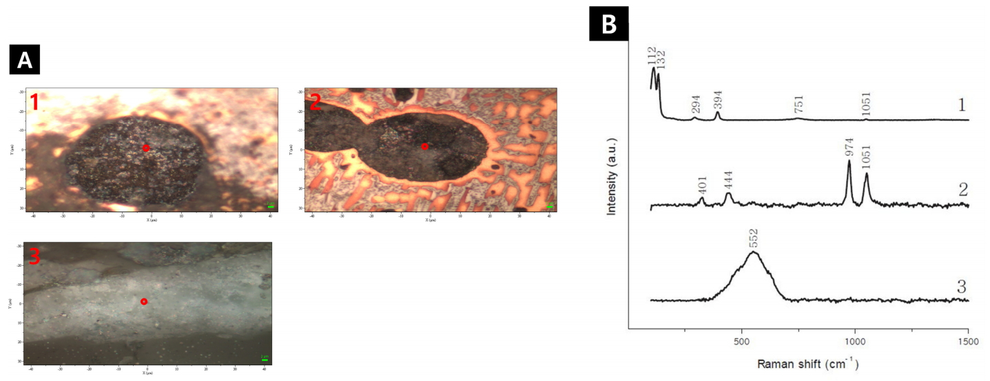 Na-4 Bronze Sword. (A)Raman optic image, (B)Raman spectrum.