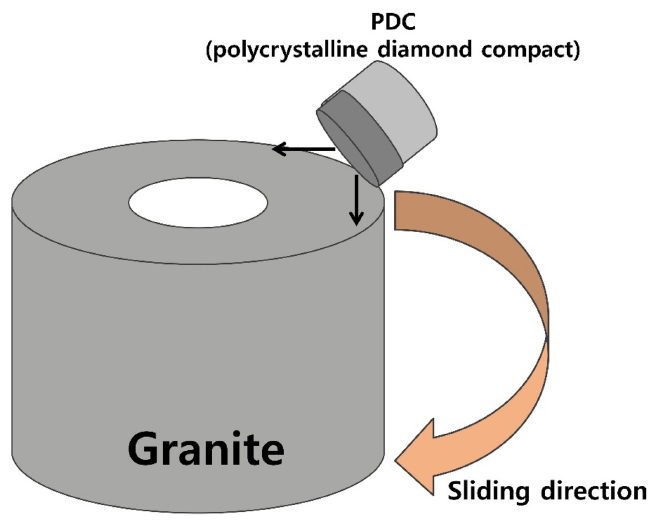 PDC의 내마모 특성을 평가하기 위해 수직 선반(vertical turning lathe, VTL) 마모 실험을 실시하였다. 그림 1에 VTL 마모 시험 방법을 도식화하여 제시하였다. 수직 선반 실험은 PDC가 피삭재를 절삭하는 방법(실제 드릴링 환경과 유사한 조건)으로 수행되었다.