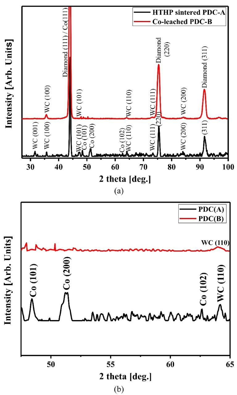Co-leached PDC-B는 Co가 제거되어 다이아몬드와 WC 상들만 검출되었다.