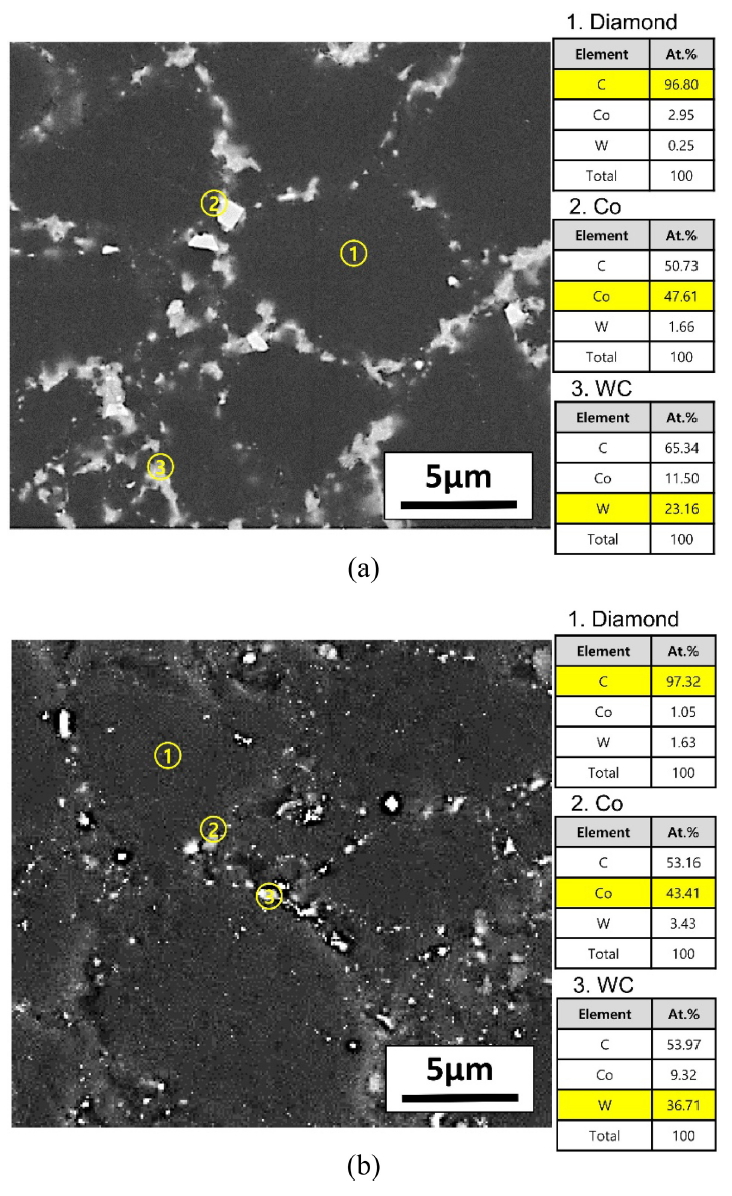 PDC 층 내부를 보다 자세히 관찰/분석하기 위해 SEM/EDS를 이용하였으며, 그 결과를 그림 4에 제시하였다. HTHP sintered PDC-A에서는 다이아몬드 계면에 바인더인 Co 및 WC들이 넓고 고르게 분포하였다. 한편 이전 연구에서
