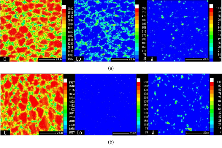 이용하였으며, 그 결과를 그림 5에 제시하였다. 여기에서 HTHP sintered PDC-A는 다이아몬드 계면에 Co 및 WC가 고루 분포하고 있었다. Co-leached PDC-B의