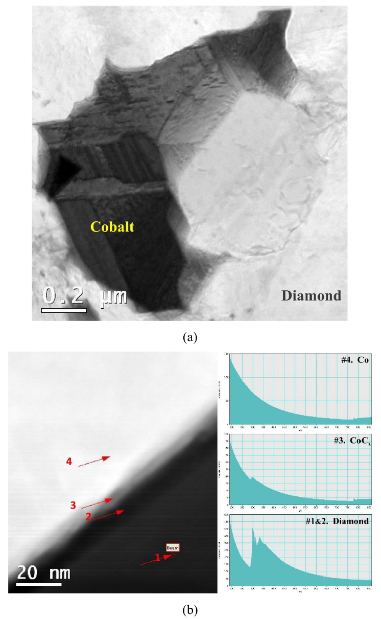 Co 계면에 CoCx 층이 생성된 것을 확인했다. 일반적으로 HTHP 소결을 수행할 경우 다이아몬드 계면에 CoCx 상이 형성되며, 상기 상은 상온에서 안정한 상태로 다이아몬드-Co 계면의 우수한 결합에 영향을 주는 것으로 알려져 있다. 즉 본 연구에서 제조된