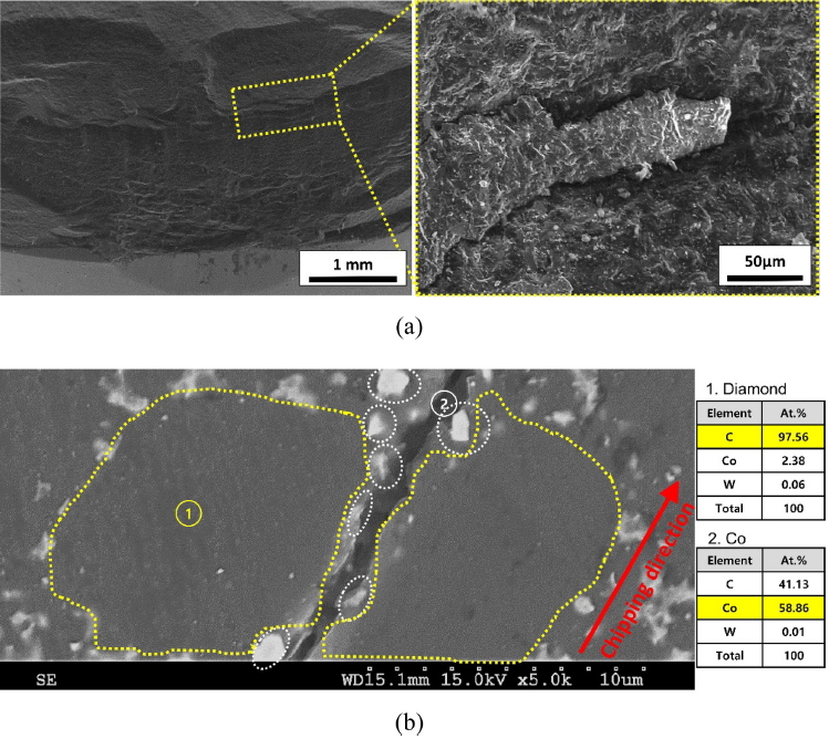(a) SEM overview images of chipping crack and (b) cross-sectional SEM image of micro