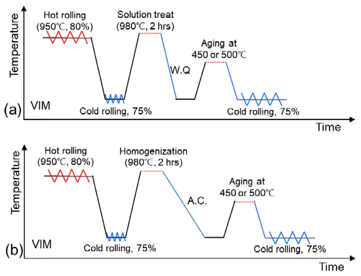 판재 형태의 원소재가 주로 요구되기 때문에, 냉간 압연을 이용하여 최종제품을 제조하는 것이 일반적이다. 따라서, 본 연구에서는 시효 전 처리에 의해