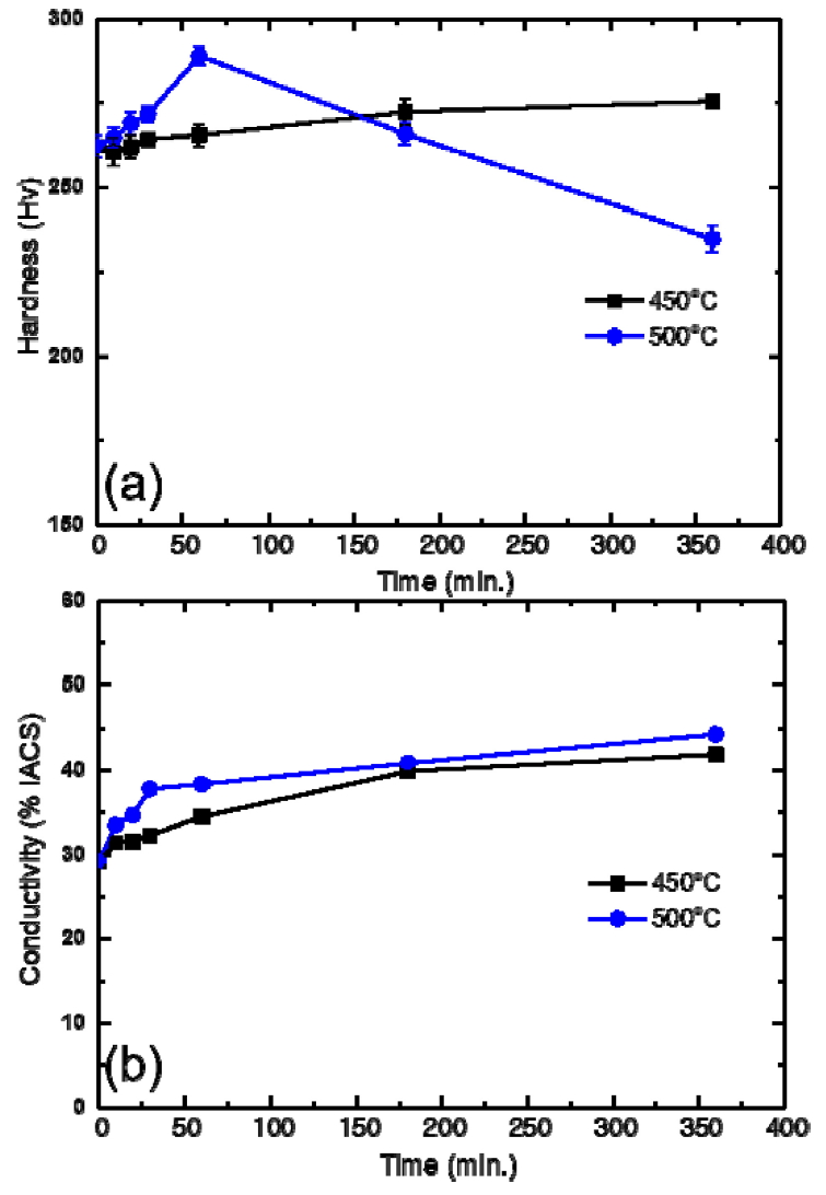 현재까지의 결과를 종합하여, 최고의 전기전도도와 강도 조합을 나타내는 균질화 처리 후 500 °C에서 6시간 시효한 합금과 용체화 처리 후 동일 온도와