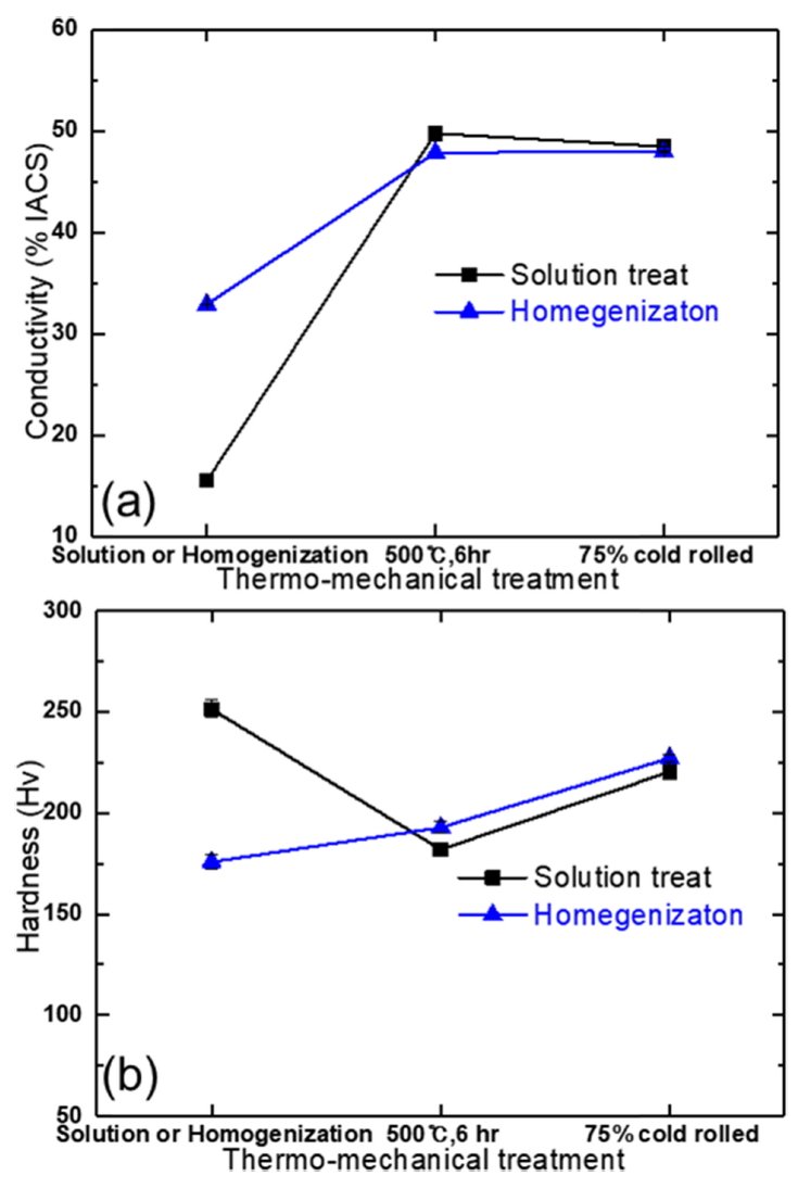 이 것을 단면적 감소율 75%로 압연하였을 때, 그림 4에 나타낸 바와 같이 전기전도도는 균질화 처리한 합금은 48 %IACS를 유지하였고, 용체화 처리한 합금은 48 %IACS로 감소하였다. 전기전도도