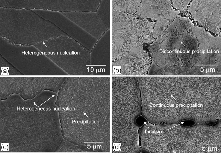 용체화 및 균질화 처리 후, 시편의 결정립계면에 불균일 핵생성에 의해 생선된 입자가 관찰되었다. 균질화 처리된 시편에서 생성된 입계 석출물은 연속적인
