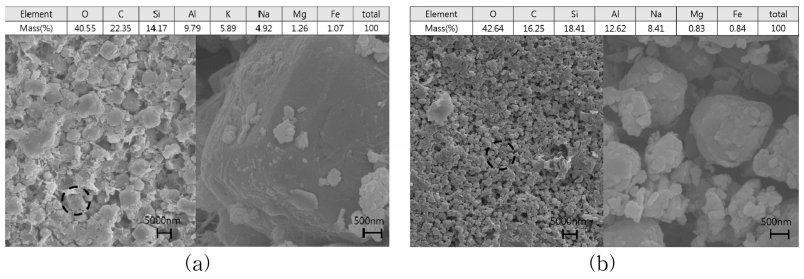 소량의 Mg, Fe가 확인되었는데, 이는 제조과정에서 첨가된 물질로 판단하였다. 또한 13X는 3A와 달리 K가 없는 것을 확인하였으며, 이는 M.
