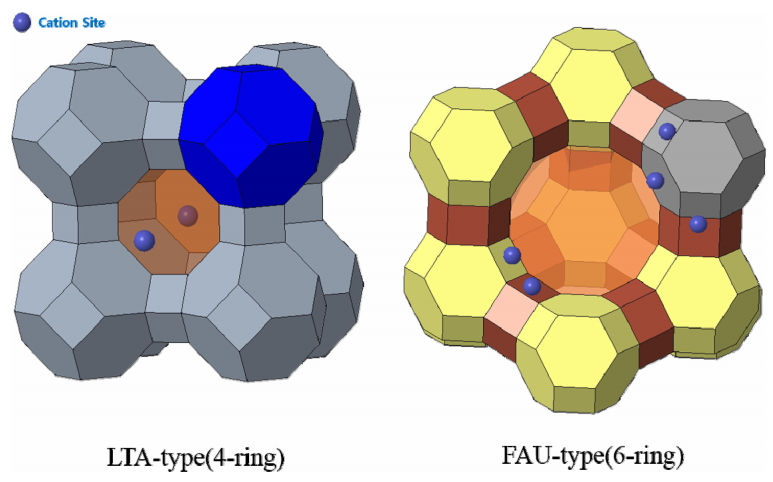따라서 제올라이트 A 타입과 제올라이트 X 타입의 주요 구성 원소는 Si, Al 이지만 이들의 몰 비율과 첨가되는 금속 양이온에 따라 결정구조가 상이한