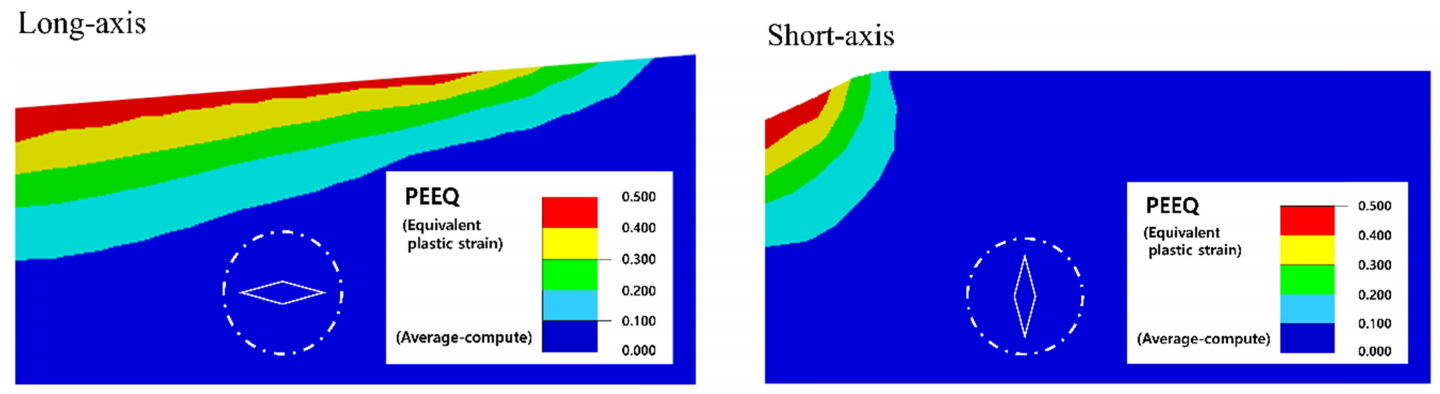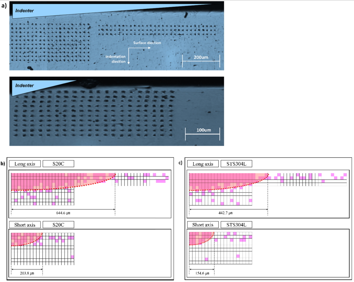 3 mm × 3 mm × 1 mm S20C and STS304L cuboids. To observe the plastic zone beneath the