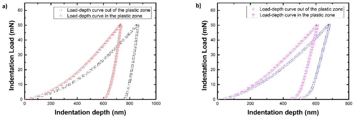 In the experiments, a Berkovich indenter was used and the maximum loading was 50 mN.