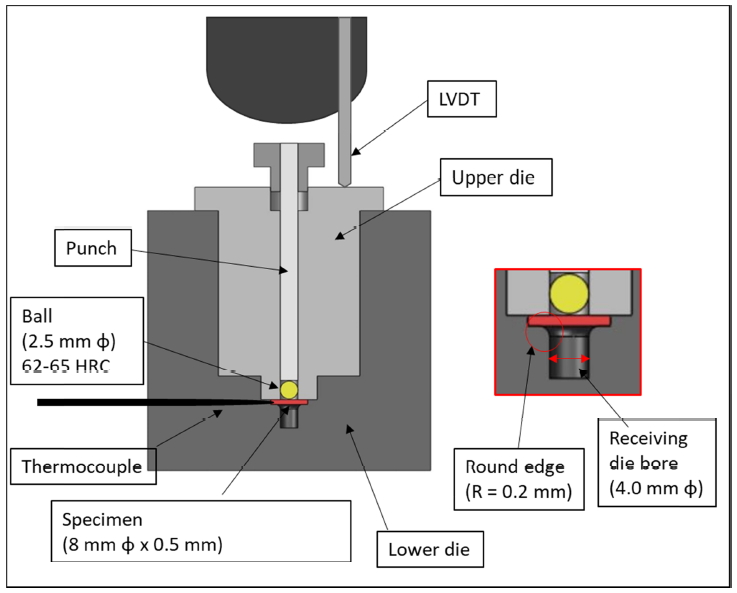 최종 두께를 맞추었다. 시험에 사용된 소형펀치 시험 지그 모습을 그림 1에 나타내었다. 상부금형(Upper die)과 하부금형(Lower die)으로 구성되어있으며 하부금형의 경우 receiving die bore 지름은