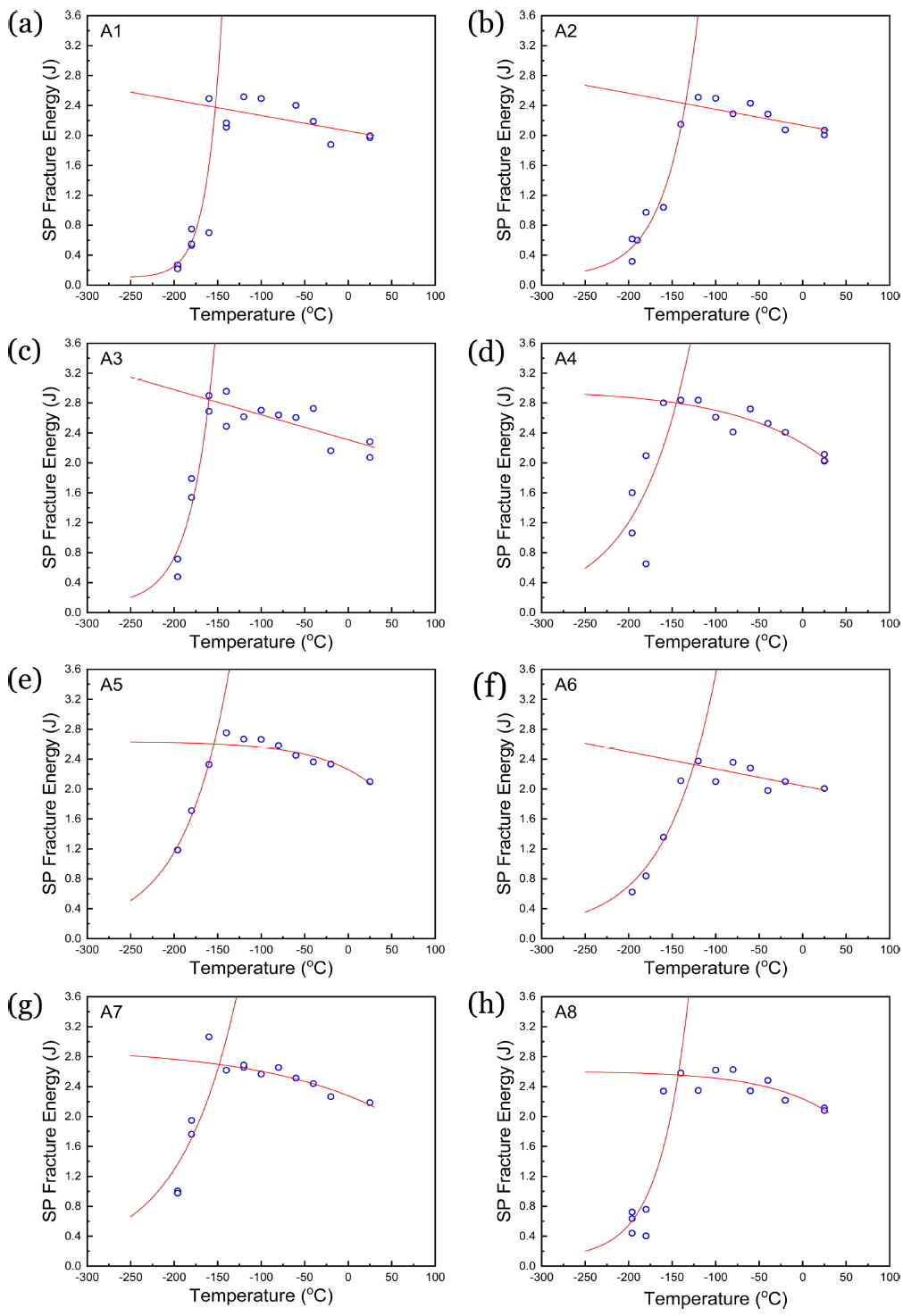 변형에 필요한 하중증가량이 변위 감소량보다 더 크기 때문이다 [21]. -160 °C이하의 온도에서는 최대 하중점에 도달하기 전에 파단이 발생하면서 ESP가 크게 감소하여 급격한 천이거동을 보여주었다. 이러한 ESP를 이용한 천이 곡선의 경우 천이구간을 정확하게 정의하기 어려우며 천이 곡선적합시 연성파괴 구간과 취성파괴 구간을 사용자가 직접 구분하여 곡선적합을