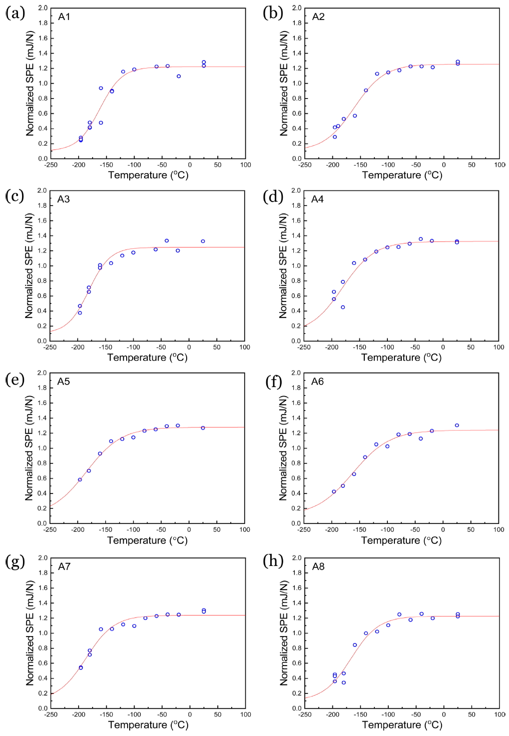 ENSP 를 얻을 수 없었다. 따라서 충격시험에서 하부 흡수에너지를 고정하고 천이곡선을 구하는 것과 같이 본 연구에서도 ENSP 하부에너지를 0.1mJ/N으로 고정하여 천이곡선을 구하였다. ENSP 하부 에너지를 0.1mJ/N은 벽개파괴가 지배적으로 나타나고 천이곡선의 중간지점이 되는 온도인 -140 °C에서 측정되는 ENSP 값의 10% 수준으로, ENSP 하부에너지를 0.1mJ/N로 고정하고 천이곡선을 적합했을 때 천이곡선과 실제 실험값이 가장 잘 일치하였다.