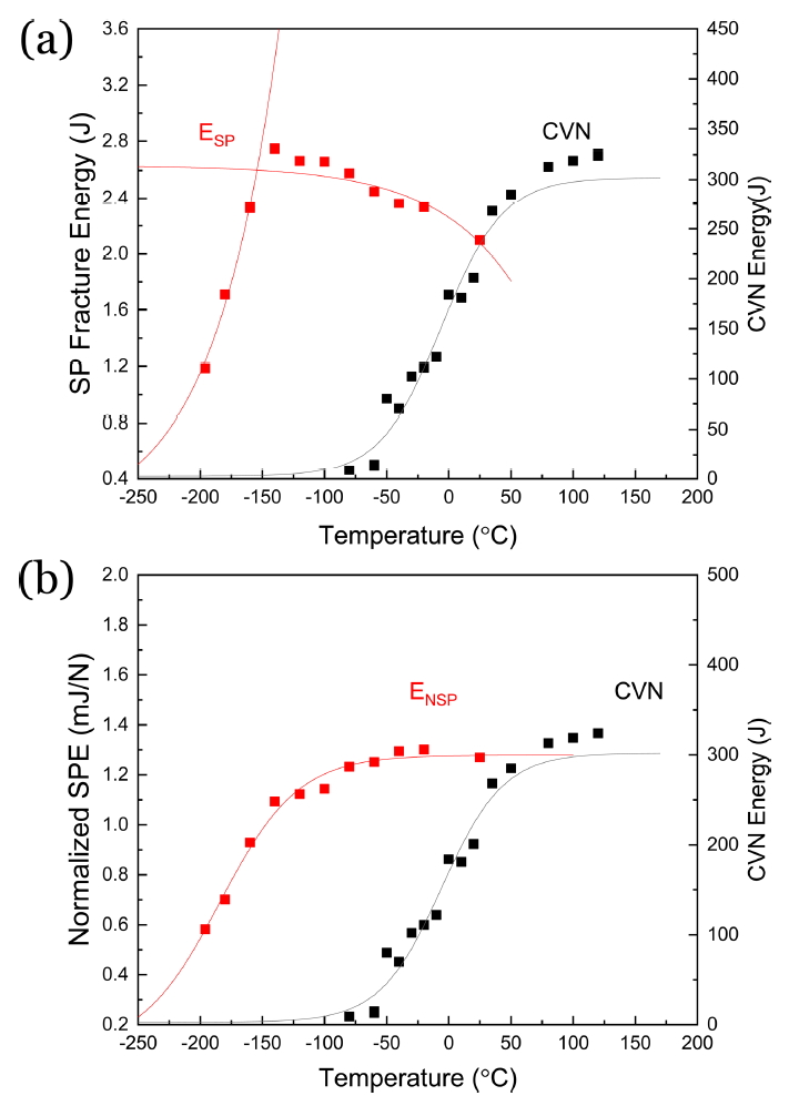 방법에서 제시한 ESP와 ENSP를 활용해 충격시험의 DBTT와 T41J 천이온도를 평가하고, ESP 천이특성 평가법과 ENSP 천이특성 평가법을 비교하여 최적의 소형펀치 천이특성 평가법을 선정하고자 하였다.