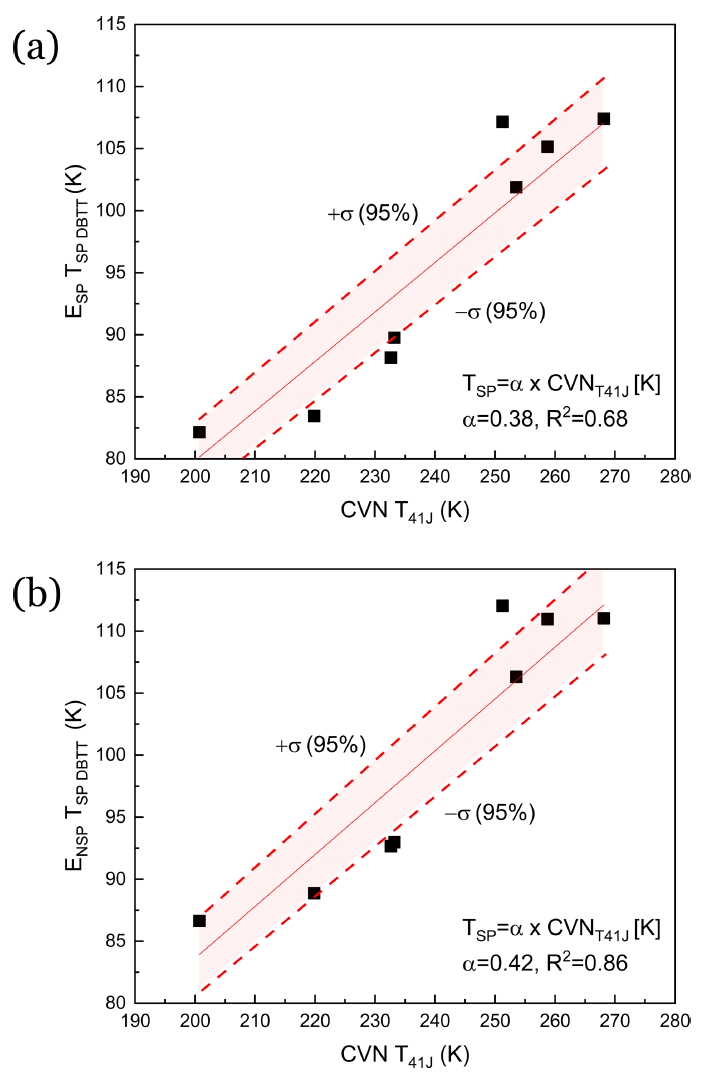 이번 연구에서는 소형펀치 시험을 통해서 CVNDBTT와 T41J을 평가하기 위한 최적 TSP 지점을 확인하기 위하여 소형펀치 시험법으로부터 얻은 ESP, ENSP 천이곡선의 천이온도 지점(ESP_DBTT, ENSP_DBTT)과 ESP 천이곡선에서 ESP 값이 0.7인 지점부터 1.7인 지점까지 0.1 간격으로 각 지점별 온도와, ENSP 천이곡선에서 ENSP 값이 0.3인 지점부터 0.8인 지점까지 0.1 간격으로 각 지점별 온도를 모두 측정하였다. 이렇게 구한 소형펀치 천이온도 지점을 CVNDBTT와 비교하여 가장 우수한 상관성을 보이는 소형펀치 천이온도 지점을 평가해 보았다. 그림 6과 같이 각 시편들의 ESP_DBTT와 ENSP_DBTT를 CVNDBTT와 식 (5)를 사용하여 상관관계를 분석하였다. CVNDBTT 가 증가하면 ESP_DBTT, ENSP_DBTT 가 증가하는 선형적 관계를 보여주었다. 식 (5)를 사용하여 곡선적합하여 비교한 결과, 다수의 시편이 신뢰구간 시그마(Sigma) 95% 범위 안에 들어오며 벗어나더라도 신뢰범위에 근접하여 위치하였다.