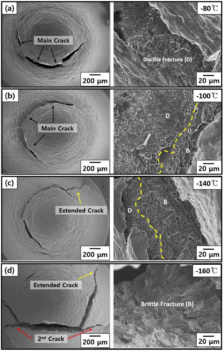 관찰하였다 [31,32]. 이러한 초기 균열은 상온에서 -80 °C까지의 온도에서는 연성파면으로 균열이 성장하고 파단이 발생하지만 온도가 낮아지는 -100 °C에서부터