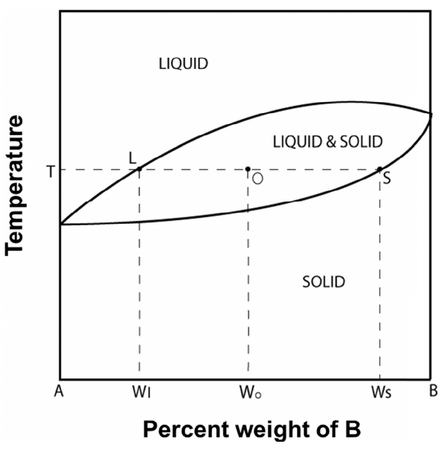 the lever rule [16] (Fig 3). That is, each temperature has its own composition. Thus, considering a mass basis,