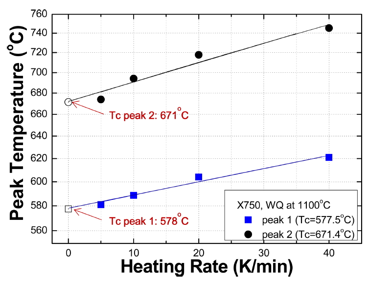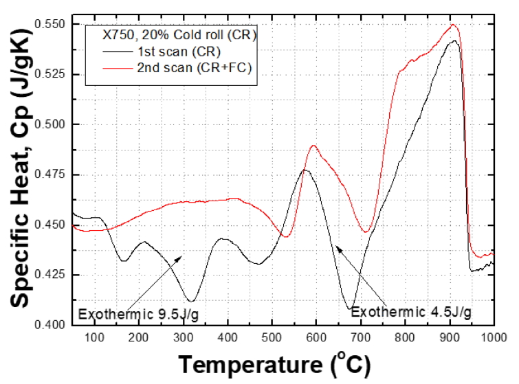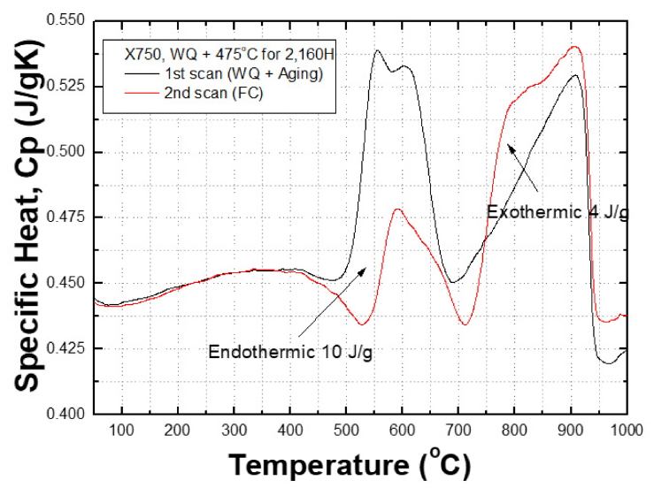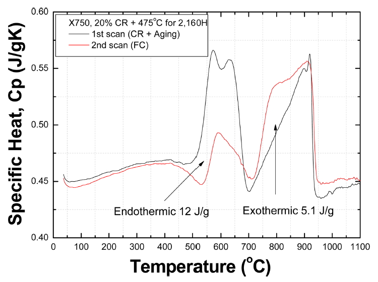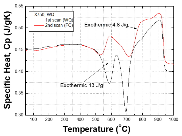 X-750์์์ SRO ๋ฐ์์ ํ์ธํ๊ธฐ ์ํ์ฌ WQ, CR, WQ+O, CR+O ์ํธ์ ๋ํ์ฌ DSC ๋ถ์์ ์ค์ํ์๋ค. ์จ๋์ ๋ฐ๋ฅธ ๋น์ด ๋ถ์์