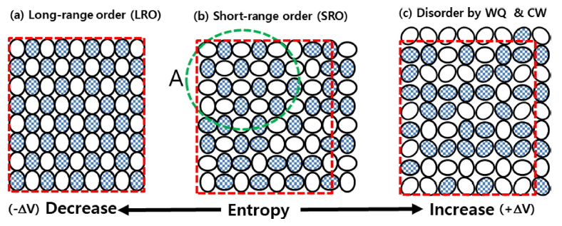 ๊ฐ์ง ์๊ณ ๊ทธ ํฌ๊ธฐ๊ฐ 2 nm ์ ๋๋ก ์์ผ๋ฉด ์ด๊ฒฉ์๋ฅผ ํ์ฑํ์ง ์์ผ๋ฏ๋ก ๋จ๋ฒ์ ๊ท์น (short range order, SRO)๋ฐ์์ด๋ผ๊ณ ๋ถ๋ฆฐ๋ค [5-15]. ์์ ๋ฐฐ์ด ์ํธ๋กํผ๋ ์์๊ฐ ๋ฐฐ์ด๋์ด ์๋ ์ํ์ ๋ฐ๋ผ ๋ฌ๋ผ์ง๋ฏ๋ก ํฉ๊ธ๋ฟ๋ง ์๋๋ผ ์ ๊ธ์์์๋ ์กด์ฌํ๋ค. ์ด๊ฒ์ ์์๊ฐ ์์ ํ ๊ตฌ๊ฐ ์๋๋ผ๋