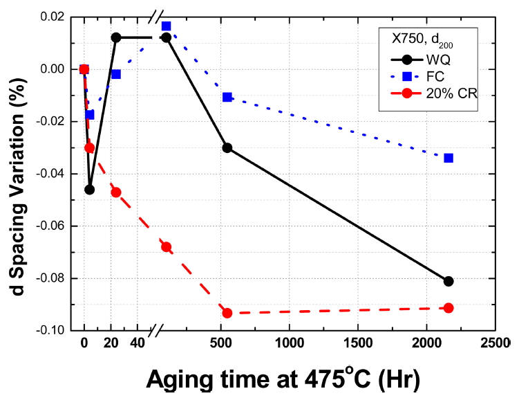 ผ๋ฌธ์ ๋ชฉํ๋ X-750 ํฉ๊ธ์์ ๊ท์น ๋ฐ์์ ์กด์ฌ์ ๊ทธ์ ๋ฐ๋ฅธ ๊ฒฉ์ ์์ถ์ ํ์ธํ๋ ๊ฒ์ด๋ค. ๊ทธ๋ฆผ 8์ CuKa X-ray๋ฅผ ์ด์ฉํ์ฌ WQ, FC, CR ์ฒ๋ฆฌ ํ 475 ยฐC ๊ท์นํ ์๊ฐ์ ๋ฐ๋ฅธ (200) ๋ฉด๊ฐ ๊ฑฐ๋ฆฌ์ ๋ณํ๋ฅผ ํจ๊ป ๋น๊ตํ์ฌ ๋ํ๋ธ