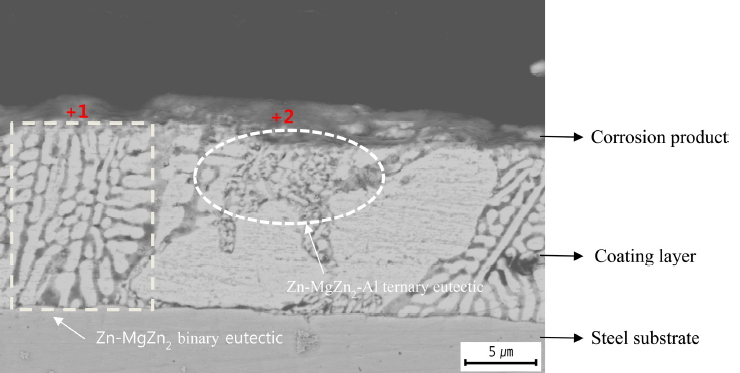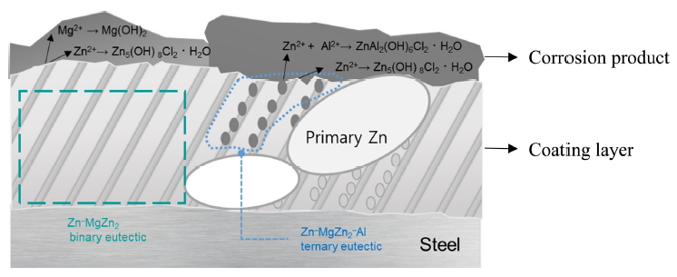 다소 복잡해 보이는 합금도금강재의 도금층은 크게 세 가지 상 (Zn 초정, Zn-MgZn2 2원공정상, 그리고 Zn-MgZn2-Al 3원공정상)으로 단순화시켜 구분 지을 수 있다. Zn 도금강재와 비교하여 Zn-Al-Mg 합금도금강재는 용융 도금 후 응고 과정에서 도금층