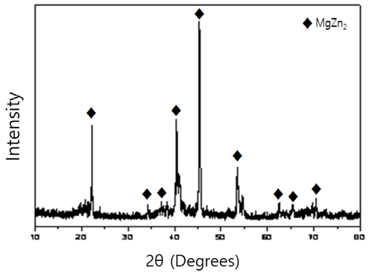 실험방법에서 언급한 바와 같이 고주파 용해 및 균질화 열처리를 통해 제작된 MgZn2 bulk 시편의 상 분석을 수행하였고, MgZn2 단일상이 제대로 형성되었음을 확인하였다 (그림 3).